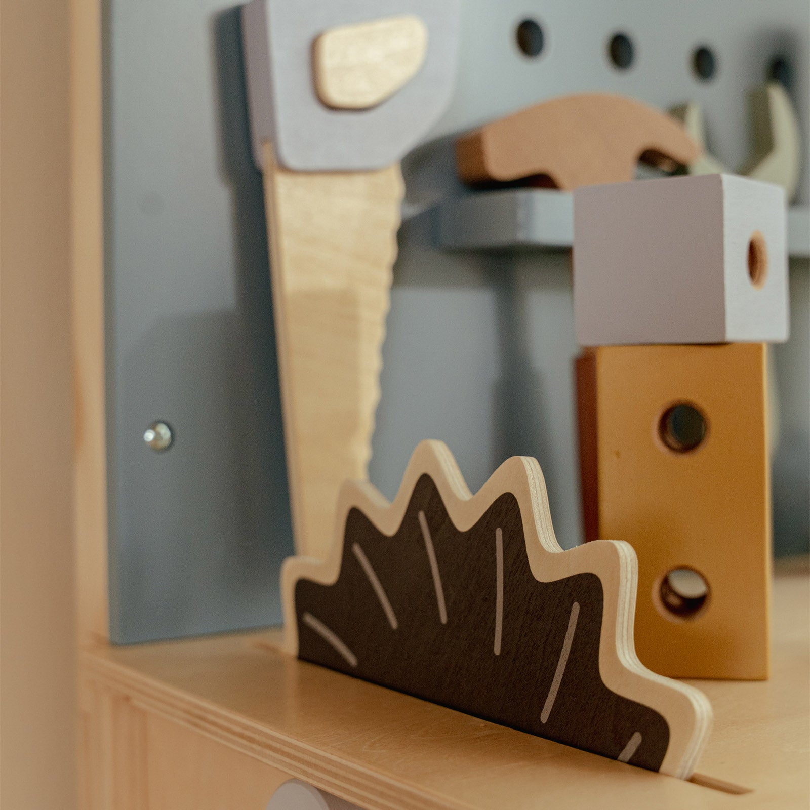 Hammer, saw and build! This sturdy wooden workbench includes tools and accessories like a circular saw, encouraging creativity, motor skills and role play.