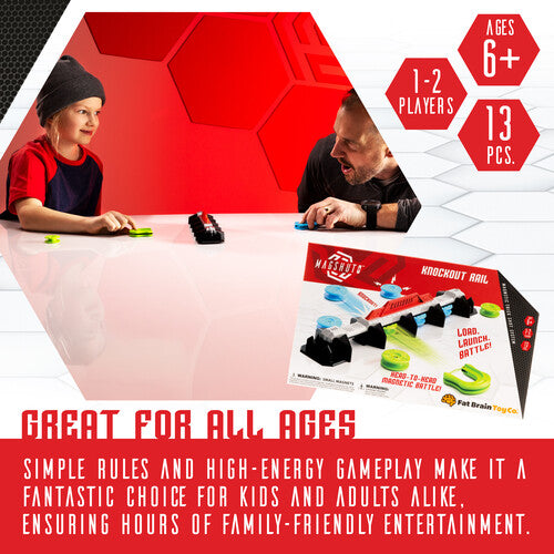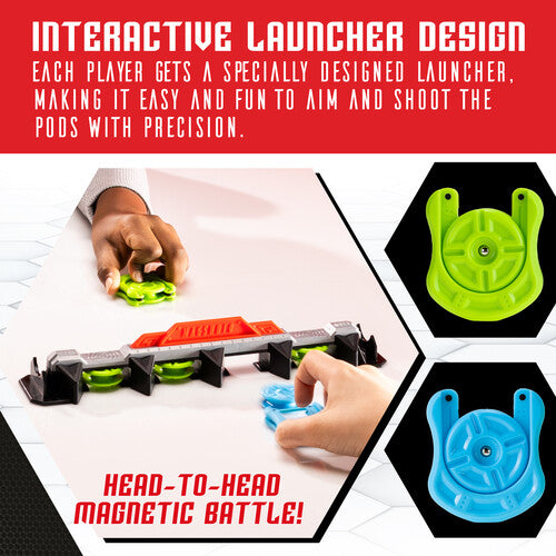 Each player loads their Mag-Pods, pulls back the launcher, and fires toward the four slot rail. Claim all slots first — or knock-out your opponent’s pod to take over their place. With trick-shot combos and magnetic dynamics, it’s an intense game of reaction and accuracy.